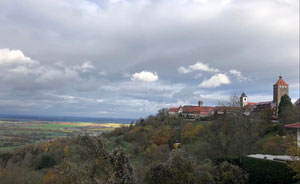 Die historische Altstadt von Waldenburg ist der "Balkon Hohenlohes" und es gibt zu beiden Seiten wunderschöne Ausblicke auf die weit unten liegende Hohenloher Ebene und den Theresienberg.